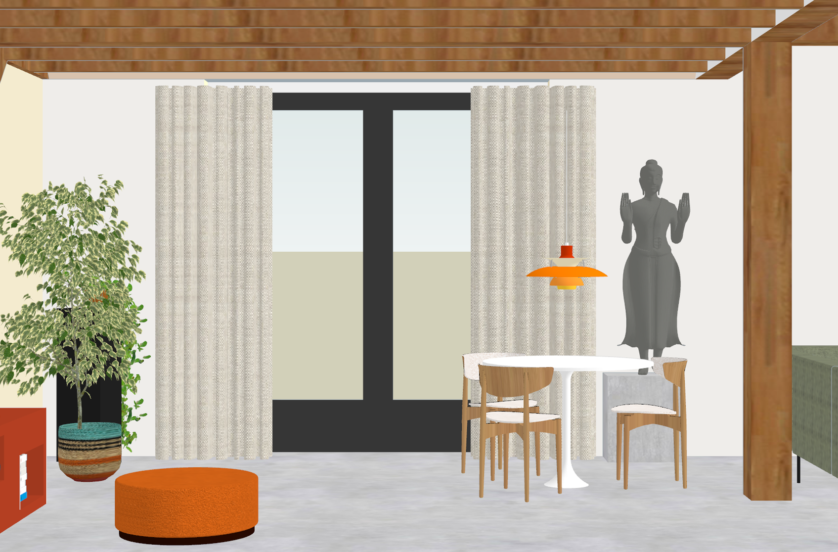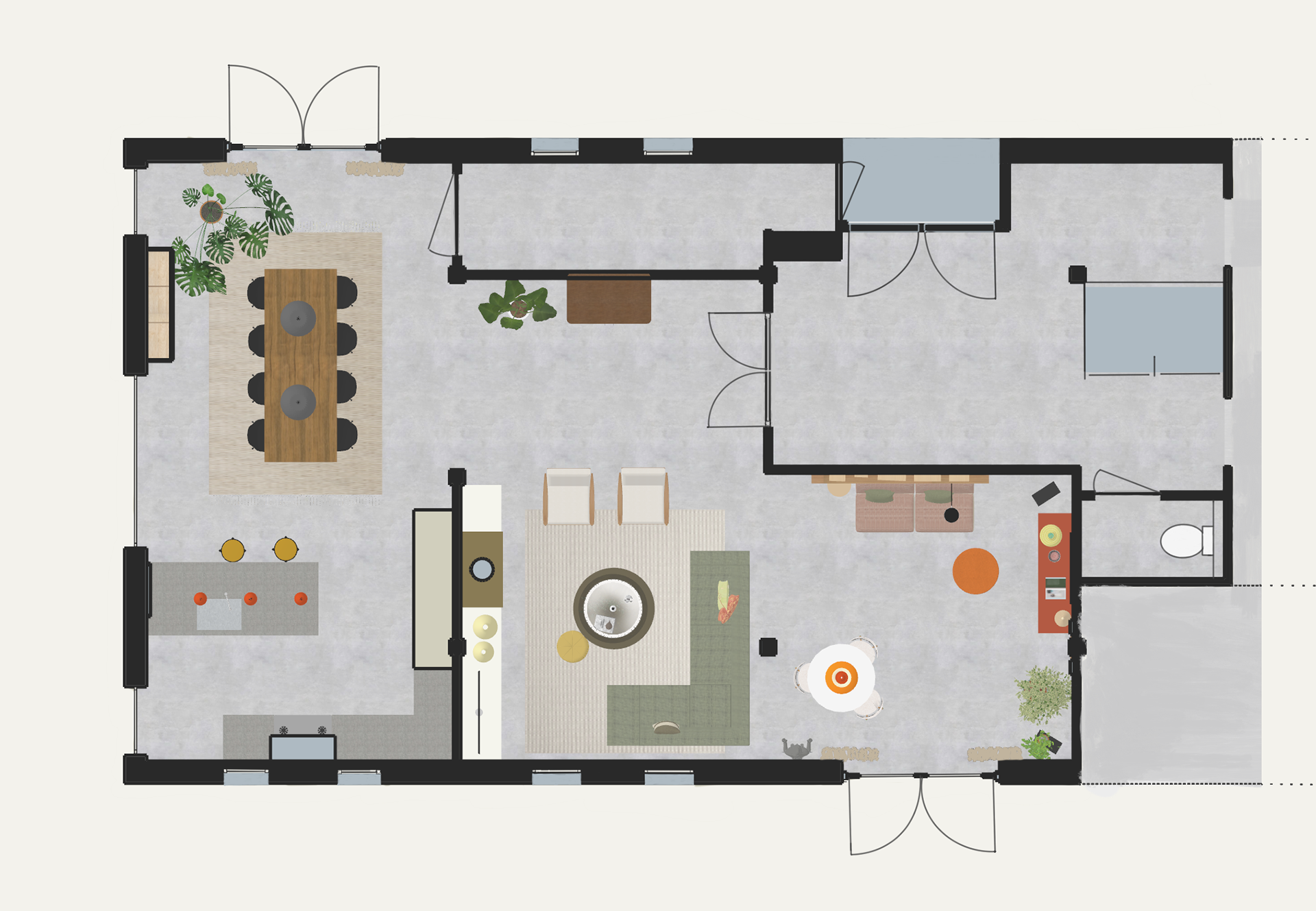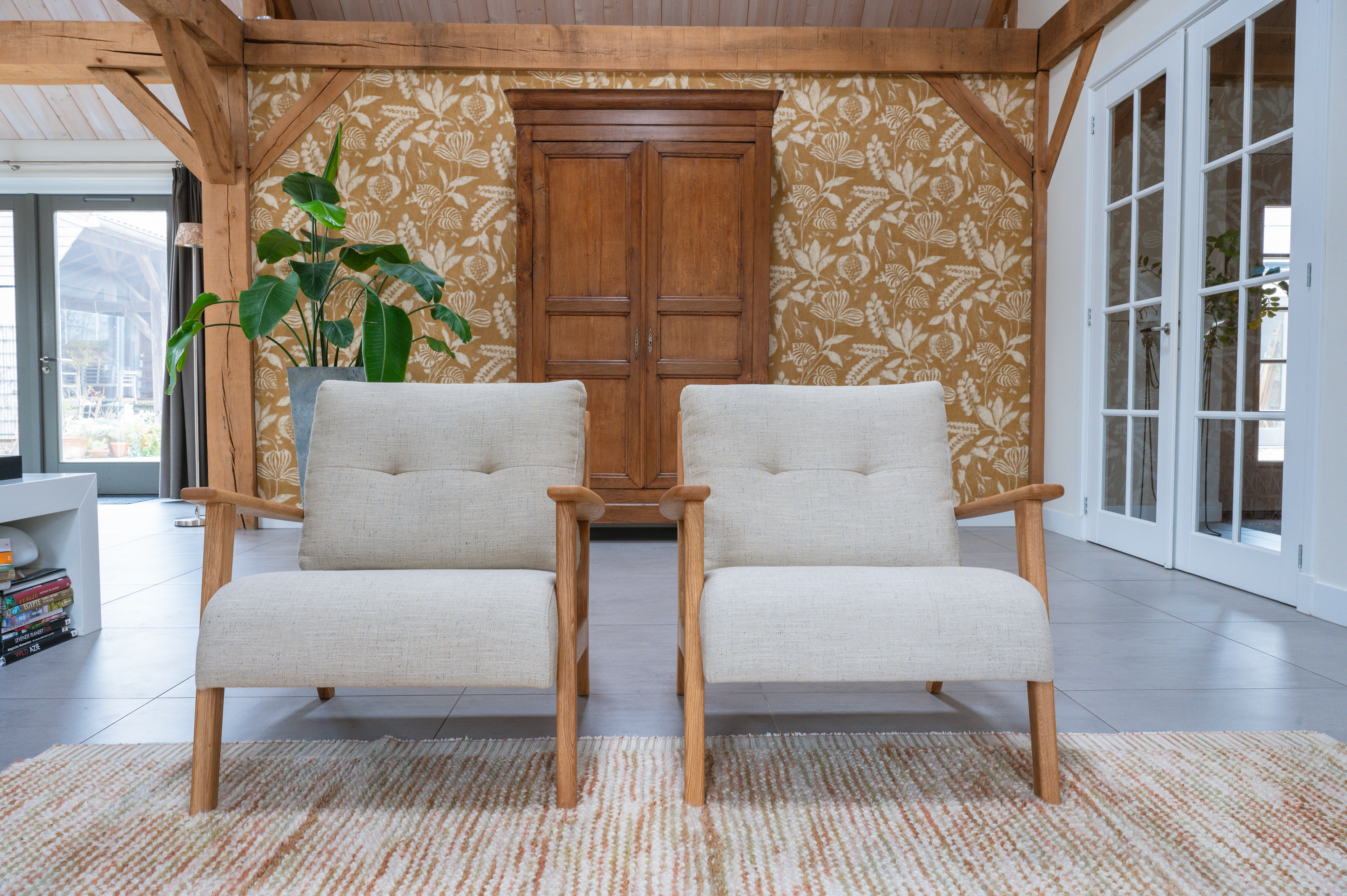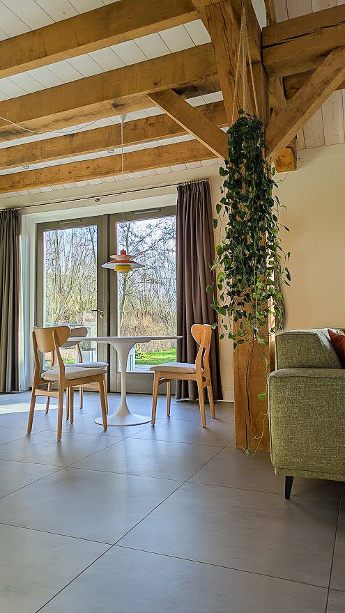 Totaalontwerp herinrichting voor een woonboerderij in Abcoude voor woonkamer, woonkeuken, hal en toilet. De behoefte van de klanten was meer licht creƫren, een betere samenhang van stijlen, toevoegen van Scandinavisch design en meer kleur.